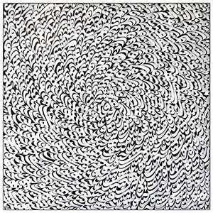 Nava explores the rhythm of Persian calligraphy as pure movement. With swirling layers of white and black script, this piece creates a sense of harmony, repetition, and flow — like a visual echo of music and breath. It’s a celebration of written form as both meaning and motion, inviting viewers into quiet contemplation and poetic rhythm.