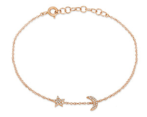 This elegant bracelet features a delicate star-and-moon design crafted in 14K rose gold and adorned with shimmering diamonds. Timeless and feminine, it captures the perfect balance of sophistication and sparkle.
