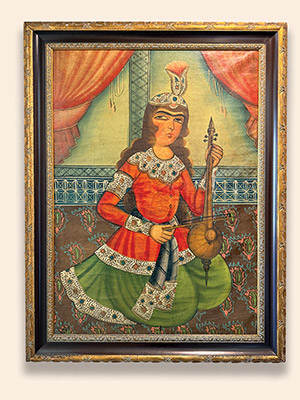 Princess with Kamancheh is a nineteenth-century oil on canvas from the Qajar dynasty by artist Mohammad Hamidi. Depicting a princess playing the Kamancheh, this framed work measures 26” W × 38” H and reflects the elegance and refinement of the era. A rare collector’s piece, it remains a timeless example of Iranian art. Framed Measurement: 34” W × 45”