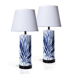 This elegant pairing brings refined style and coastal charm into any home. The Fontainebleau Tabletop Lamps combine stainless-steel durability with timeless design, featuring a crisp white porcelain base delicately decorated with blue leaves and resting on an ash wood plate. Topped with a white cotton Euro-style shade and equipped with a UL rotary dimmer on the plug cord, it offers both function and sophistication.