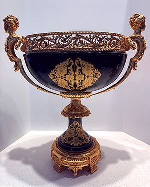 This cobalt blue Sèrve-style porcelain centerpiece is richly decorated with hand-painted detail and set in an ornate gilt bronze mount. Measuring 25” high, 22” long, and 11” deep, it blends fine craftsmanship with timeless design, serving as both a striking decorative object and a refined statement piece for the home.