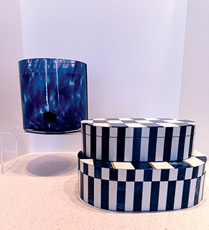 This Zodax 5-wick candle jar radiates an iridescent glow, filling any space with warmth while serving as a striking centerpiece. Paired with it is a set of two Indian decorative boxes, expertly handcrafted from bone and resin in a modern blue-and-white checkered pattern with brass inlays. Together, they create a perfect balance of light, elegance, and functional storage.
