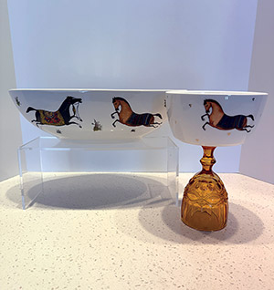 From the Torkaman Horses Collection, this large oval ceramic bowl (14 × 8 × 4.25 inches) is partially hand-painted and features its intricate equine motif on one side, blending functionality with artistic detail. Complementing it is a small ceramic bowl (6 inches in diameter), presented on an amber glass stand.