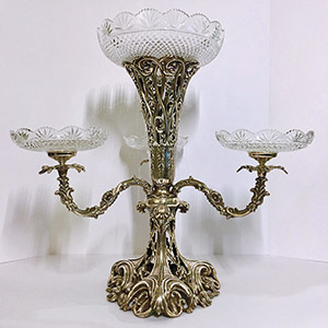 An Old English Victorian Epergne centerpiece, circa 1870. This exquisite piece exemplifies the elegance and craftsmanship of the Victorian era, making it a stunning addition to any collection or display.