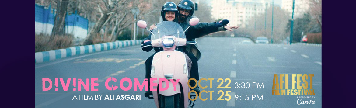Notable Iranian filmmaker Ali Asgari (co-director of TERRESTRIAL VERSES, AFI FEST 2023) blurs the lines between fiction and reality / cinema and truth in his latest feature, DIVINE COMEDY. Featuring rival filmmaker twins Bahram and Bahman Ark (as themselves), Bahram has just completed his newest film with producing and romantic partner Sadaf (Asgari, as her namesake). However, due to the film’s use of his native tongue Turkish-Azeri, they’ve been denied a local screening permit from the Ministry of Culture, again. Over the course of a single day, we follow Bahram and Sadaf — mostly on the back of her pink Vespa — through the streets of Tehran on a mission tinged with cinematic urgency: to screen their film in its original language… at home. Pure comedy ensues as the charming pair whisk from venue to venue in search of a willing party to host an underground screening of their banned film. With DIVINE COMEDY, Asgari continues to tackle themes of artistic expression and government censorship, this time commenting on the film industry as a whole — and slyly expanding the very notion of self-awareness in cinema. – Julia Kipnis